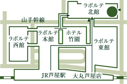 芦屋を代表する複合施設「ラポルテ」の北館 2 階にイマジン語学スタジオは所在します。最寄り駅の JR 芦屋駅に直結し、薬局やクリニック、証券会社のテナントが多く入居するラポルテ北館では、とても静かに、語学レッスンを提供できています。